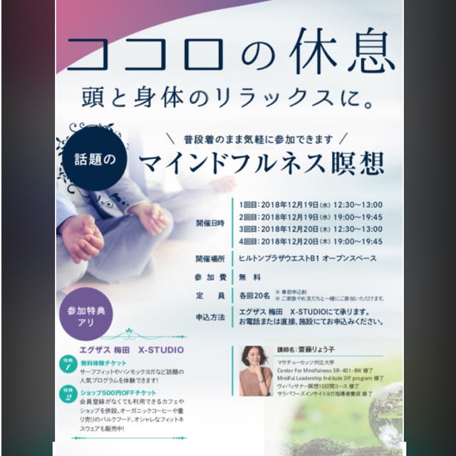 インストラクターブログ mindfulness in hilton Posted on 2018年12月26日 by りょう子 こんばんは✨ りょうこです 先週のこと、大阪のhilton plazaでマインドフルネスメディテーションをさせていただきました リラックスできた、頭がスッキリした、など嬉しい感想をいただけ、学んだことを活かして少しでも健やかになってくれる人がいることに改めて幸せを感じました🌱 忙しい時こそ立ち止まり、マインドフルに呼吸やマインドを見つめ、残り数日となった2018年を自分らしく丁寧に、 新しい1年を充実した時間をお過ごしください✨ 残りわずかとなった2018年、素敵な夜をお過ごしください✨ りょう子 りょう子先生の投稿をすべて表示