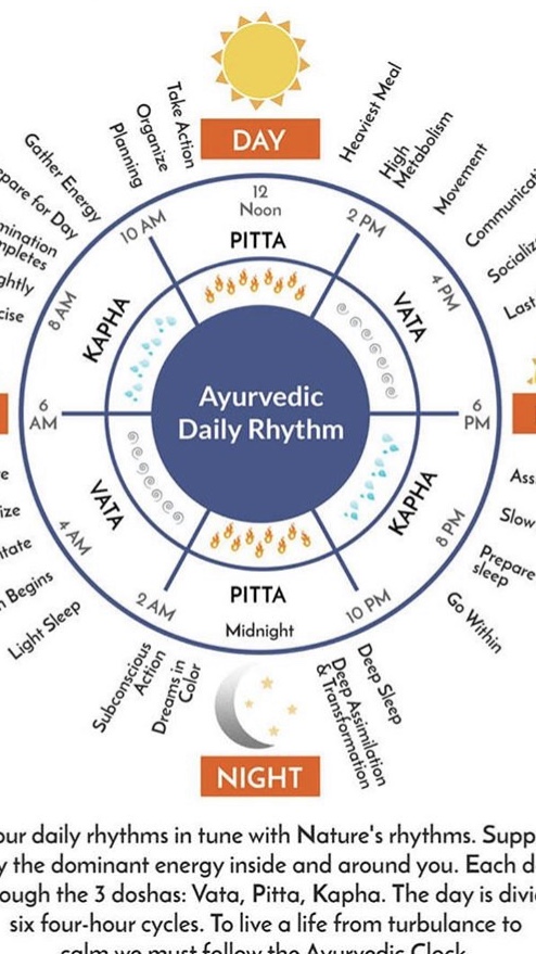 インストラクターブログ ayurvedic daily time Posted on 2019年5月31日 by りょう子 こんばんは🌆 りょうこです 明日から6月ですね! 季節の変わり目は体調を崩しやすいので、無理はせず、自分の体を丁寧にケアしつつ過ごしていきましょう! 写真はアーユルヴェーダにおける、1日の体のリズムです。体質にもよりますがこれを参考に過ごせるとバランスが整って快適に過ごせます。 夏を健やかに過ごすためにも、今の時期の体調管理がとても大切なのだそう。 ご参考にされてみてください😊 りょう子 りょう子先生の投稿をすべて表示