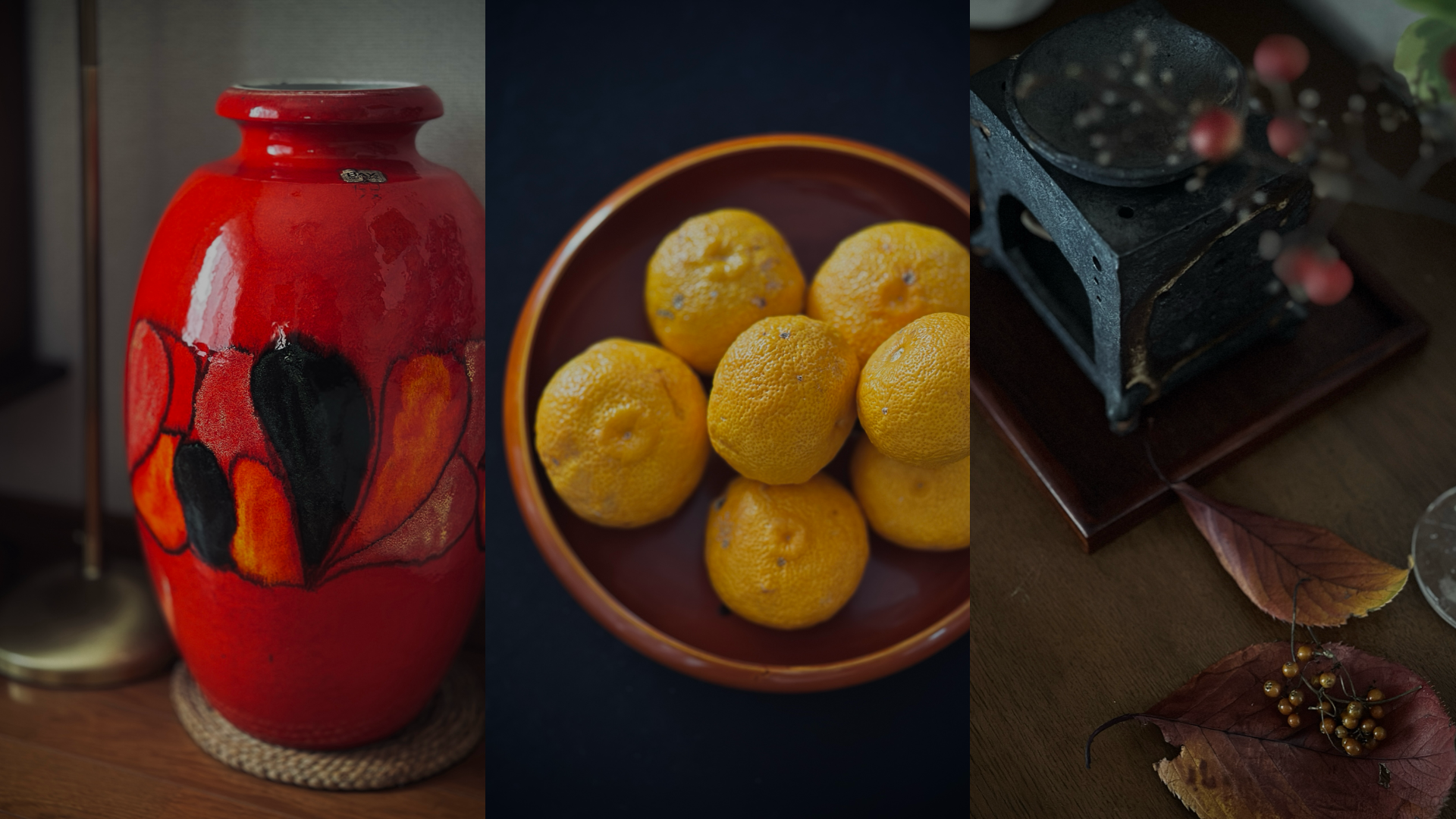 お気に入りのヴィンテージの壺、毎年この時期に行う「柚木仕事」、散歩して拾ってきた落ち葉を茶香炉のそばにディスプレイしたもの。